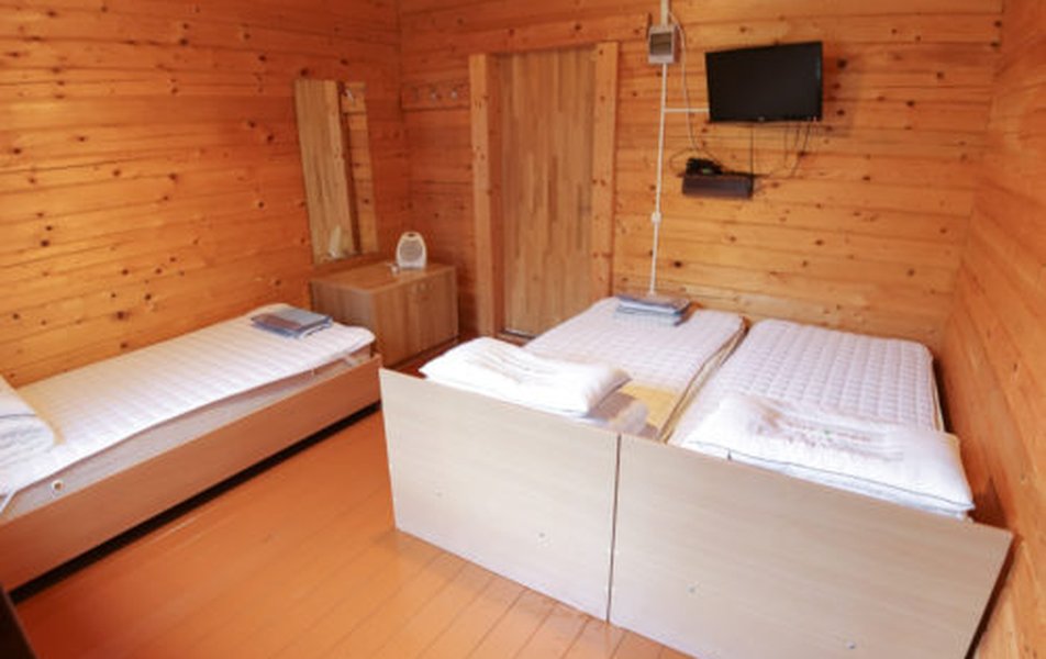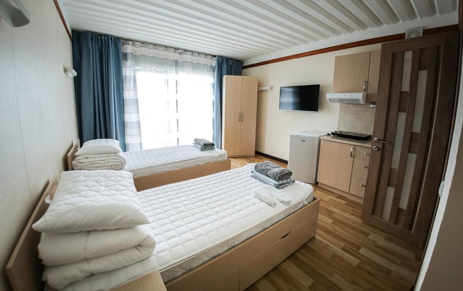 В номере: кровати односпальные /одна двуспальная кровать, кровать двухъярусная, кухонная мебель, прикроватные тумбочки, стол, стулья, мини-кухня, кондиционер, мини-холодильник, набор посуды, плита электрическая, телевизор, электрочайник