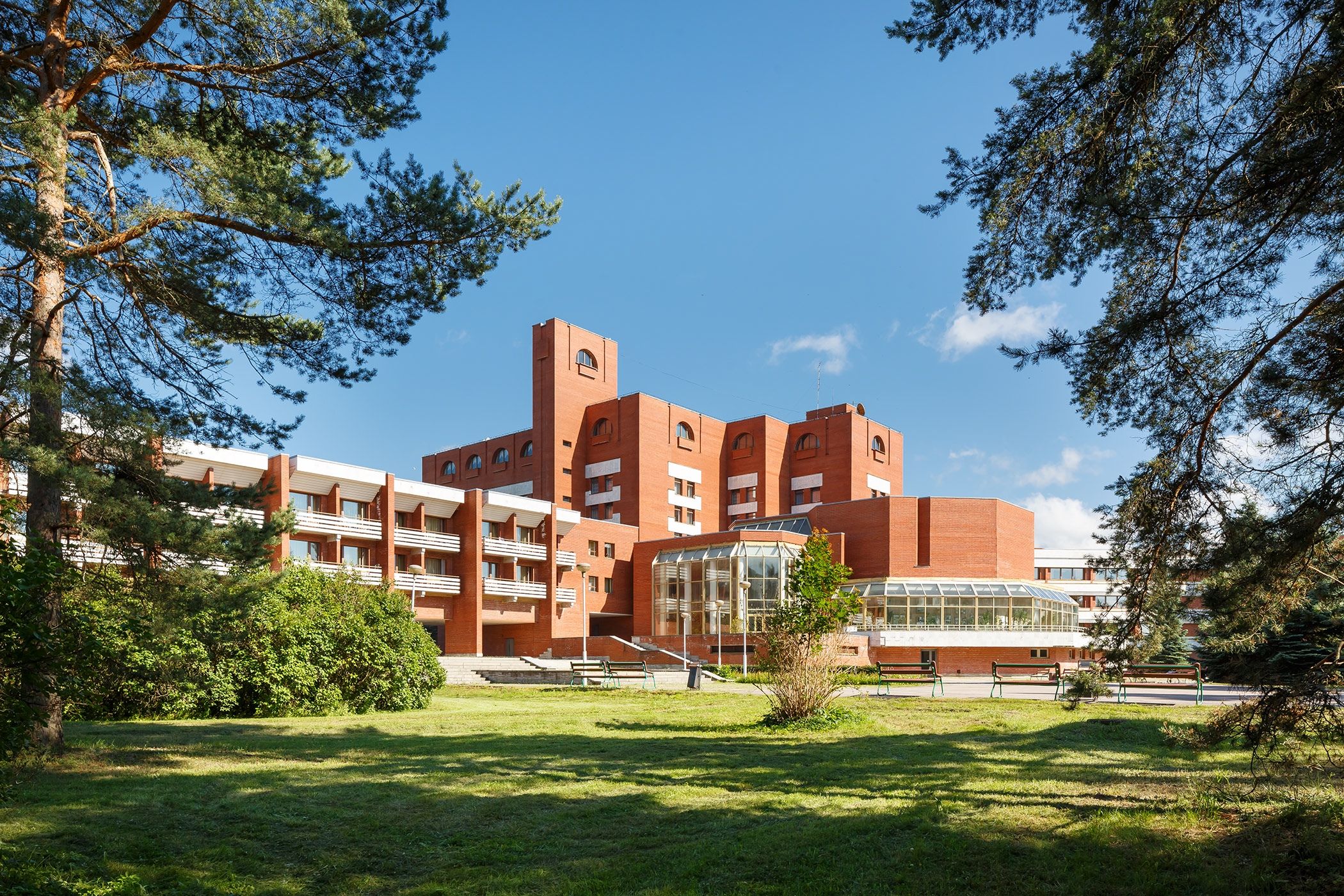 В главном корпусе под одной крышей объединены все отделения санатория: медицинская часть, комфортабельные жилые номера, лечебно-физкультурный комплекс со спортзалом и бассейном, киноконцертный комплекс и другие службы.