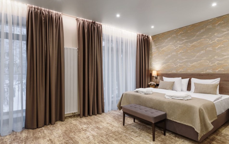 В номере: вешалка, диван, зеркало, кресло, кровать двуспальная, прикроватные тумбочки, стол, шкаф, мини-холодильник, сейф, телевизор ЖК, телефон, чайный набор посуды, электрочайник