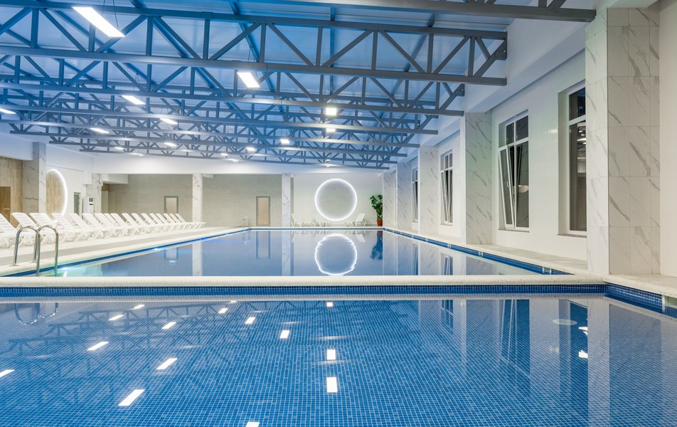- Крытый малый бассейн – площадь 90 м², размеры 6 × 15 м, глубина 0,6 м, подходит для детей и взрослых. Рядом душ и шезлонги.