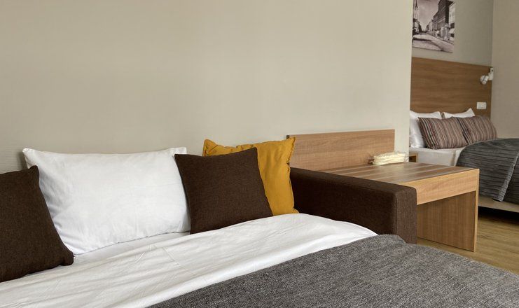 В номере: кровати односпальные /одна двуспальная кровать, прикроватные тумбочки, стол, стулья, диван, шкаф, мини-кухня, набор посуды, сейф, сплит-система, телевизор, телефон, холодильник, чайный набор посуды, электрическая плита, электрочайник
