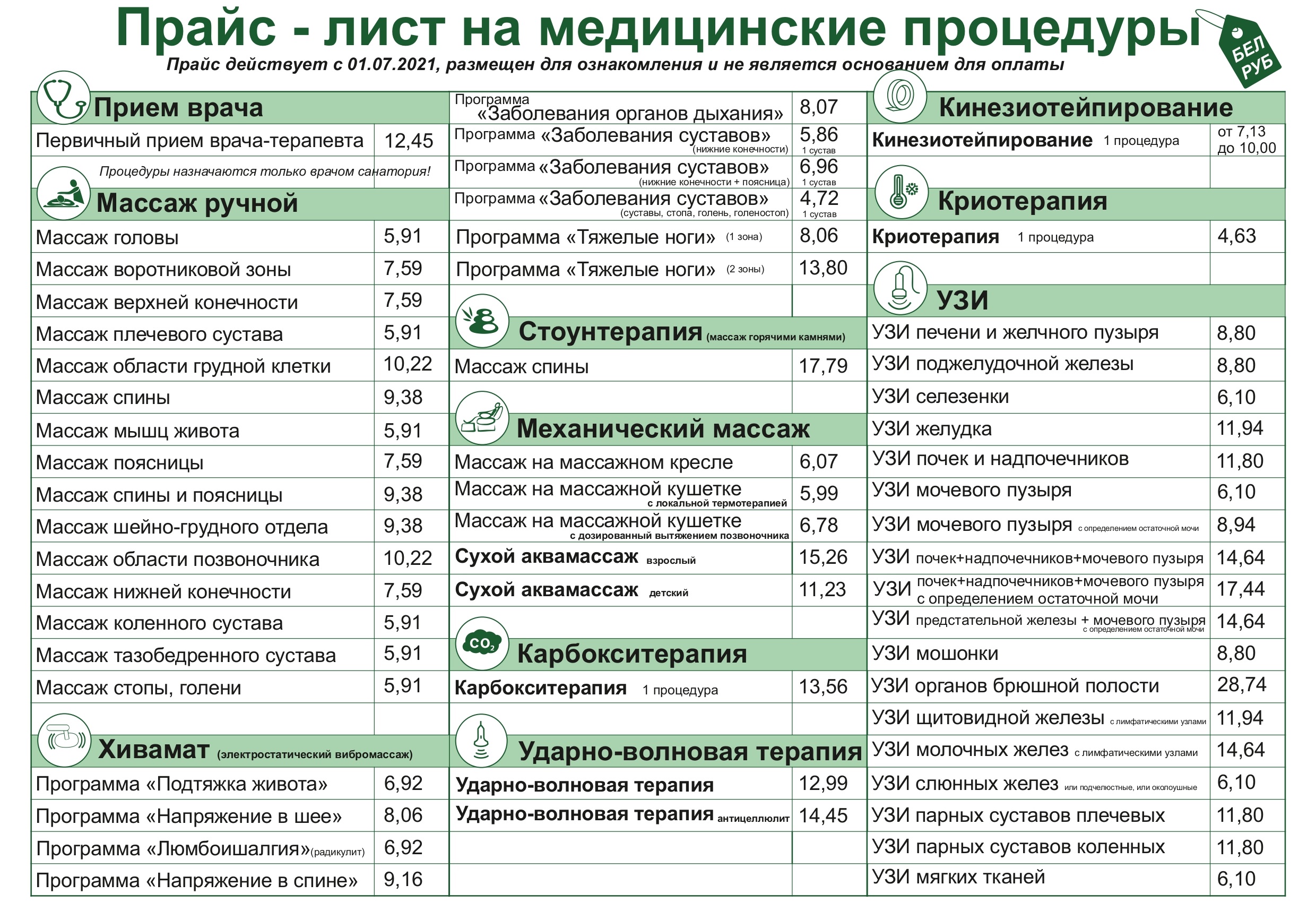 Прейскурант цен на процедуры, оказываемые в санатории «Надзея»