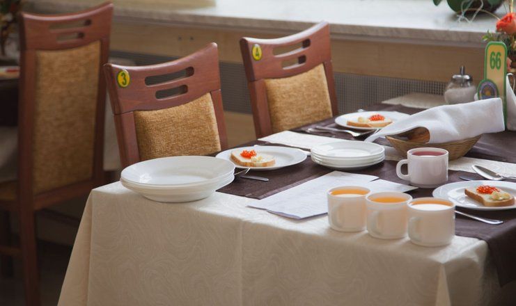 Столовая, с двумя уютными обеденными залами на 500 посадочных мест, расположена в главном корпусе санатория на втором этаже. В санатории организовано пятиразовое питание в одну смену, а для больных сахарным диабетом и лиц, нуждающихся в частом и дробном питании, предлагается дополнительный завтрак в 11:00 часов.