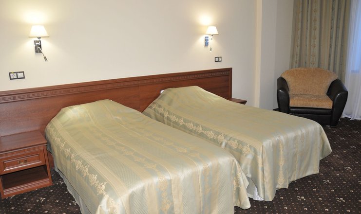 В номере: две удобные отдельные кровати, две тумбочки, кресло-кровать, журнальный столик,два стула и сьменный стол, настольная лампа, шкаф с зеркалом, ЖК телевизор, телефон, стеллаж, мини-бар, электрический чайник, набор посуды,сейф, бесплатный wi-fi, кондиционер